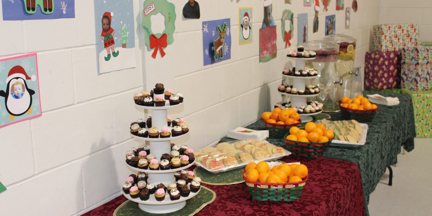 Each year leading up to Christmas, our talented cooks make a beautiful Christmas lunch for our young moms and their children. Often for many of our young families this might be their only turkey dinner, so we do our best to make it special. Dessert included nut-free mini-cupcakes from Thimblecakes, and tasty Christmas shortbreads baked by our good friends at Hydro Ottawa, who were here earlier in the month for a day of volunteering.