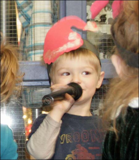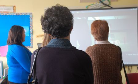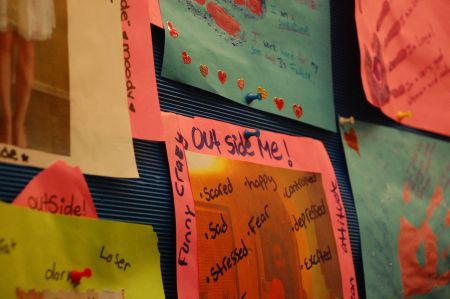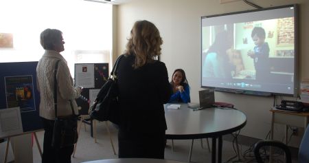 After the introductions, guests were invited to tour the hallway to look at the scrapbooks, and to visit each classroom where artwork and videos were on display. Each student stood beside her work of art, whether it was a video or a scrapbook, so that guests could interact with her and talk about her experiences.