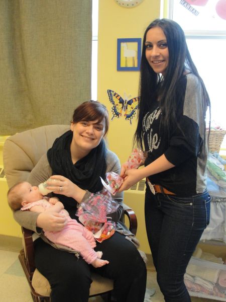 Youville student Nicole gives a candy gram to Krista, a Lead Teacher in our Child Development Program. Krista is seen here feeding baby Nora in the Daffodil program.