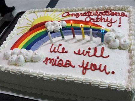 To wish Cathy well, we held a surprise get-together with all current students, children and staff members. Roses were given to Cathy by the students with each young mom thanking her for a different quality she brought to the centre, such as a sense of humour, a listening ear and for “being real”. A handmade card was presented as well as a collage of photos in a frame, and the celebration was topped off with a cake!